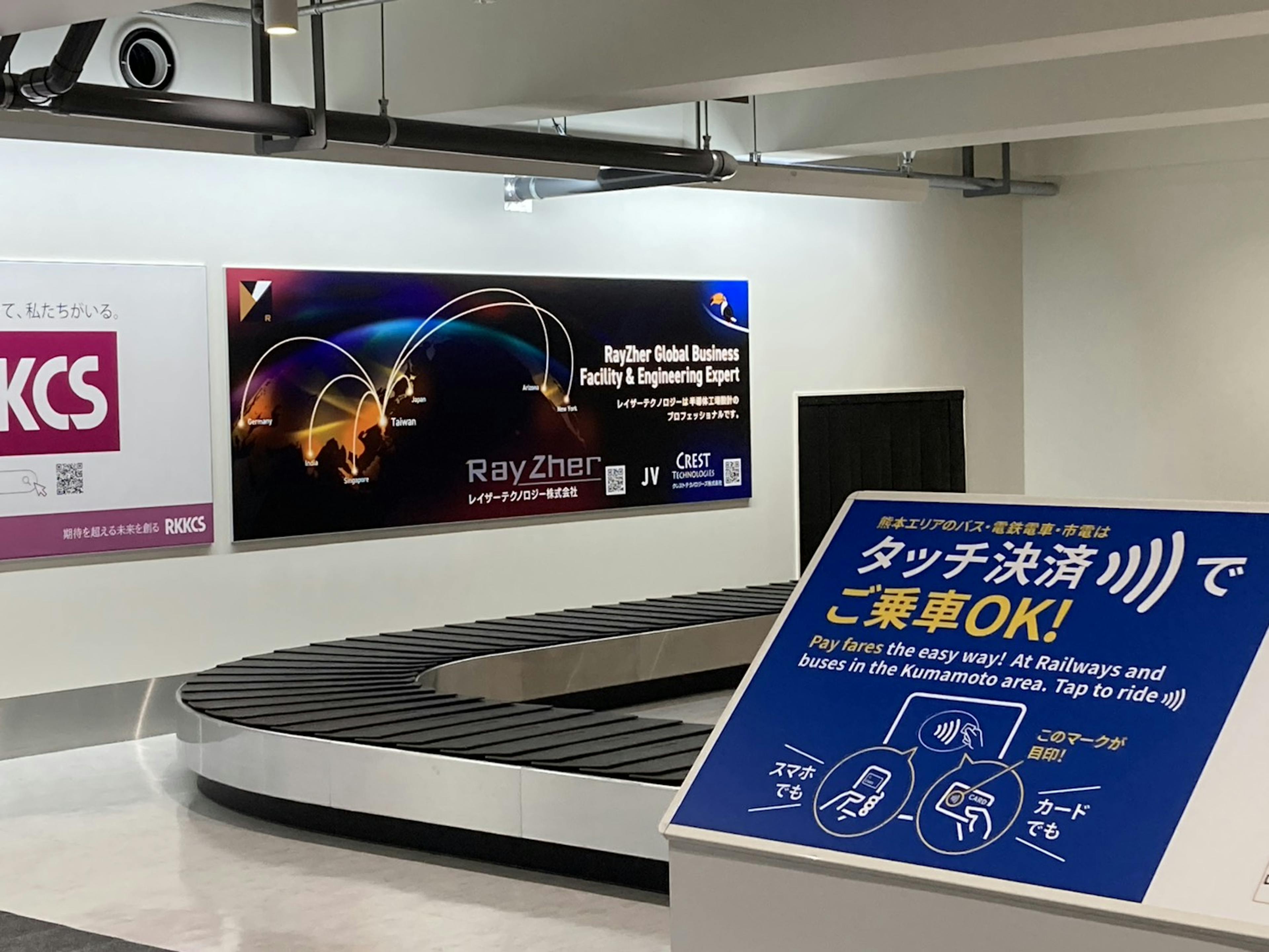 この度、当社出資先であるレイザーテクノロジー株式会社と共同で熊本空港(1階チェックインカウンター及び国内線3番手荷物受取所)に看板広告を掲出しました。